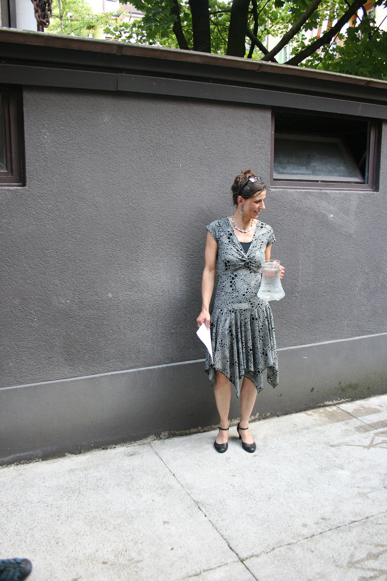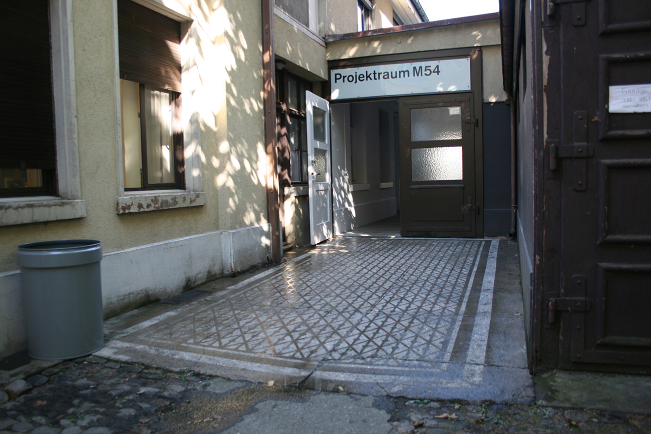 Die Bodenarbeit «Entrée» befindet sich vor der Eingangstür zum Ausstellungsraum. Bei trockenem Wetter entzieht sie sich dem Blick – erst wenn der Regen kommt, wird nach und nach ein grosser Teppich sichtbar, der sich auf dem ganzen Platz ausbreitet. Ein Spiel mit Aussen- und Innenraum, Sichtbar- und Unsichtbarkeit – und den Erwartungen der Rezipient*innen diesbezüglich.