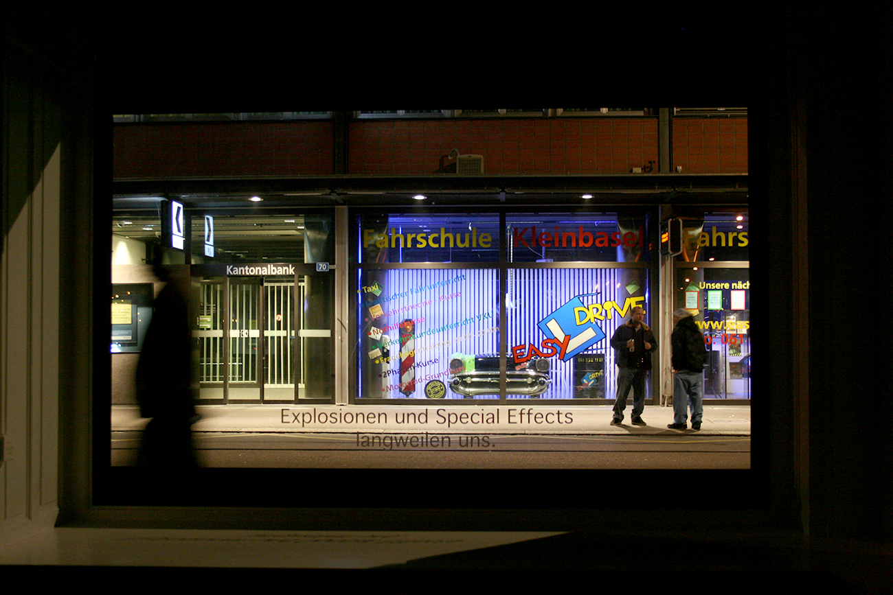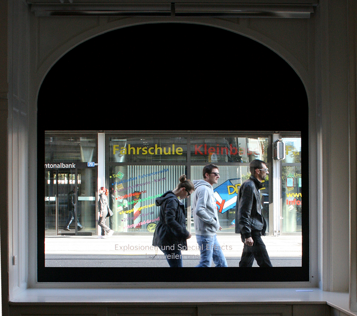 «In der Intervention ‹OmU› verschieben und überlagern sich diverse Raumerlebnisse auf ganz andere Weise. Im Inneren von DOCK, auf den bequemen Kinosesseln sitzend, wird das Jetzt im öffentlichen Raum durch das im Breitbildformat maskierte Fenster zur filmischen Szene. Zugleich ist die Kinosituation von Aussen sichtbar und die Zuschauer*innen in den Sitzen werden zu Betrachteten, was zu Unklarheiten führt: Wer ist Objekt und wer ist Subjekt? […] Um das Verwirrspiel von Realität und Illusion zu komplettieren, finden während der Ausstellungsdauer vor Ort kurze Interventionen statt. Wann und wie und wer ist nicht bekannt. Dieses Wissen um die Möglichkeit eines inszenierten Eingriffes in das alltägliche Geschehen verschiebt, wie die Rahmung unseres Blickes, unsere Wahrnehmung und hinterfragt unsere Einordnungen. Die Wechselwirkung von Wirklichkeit und Fiktion wird durch ‹OmU› erfahrbar und wirft Fragen auf nach dem Umgang mit Bildern in der heutigen, medialisierten Welt.»